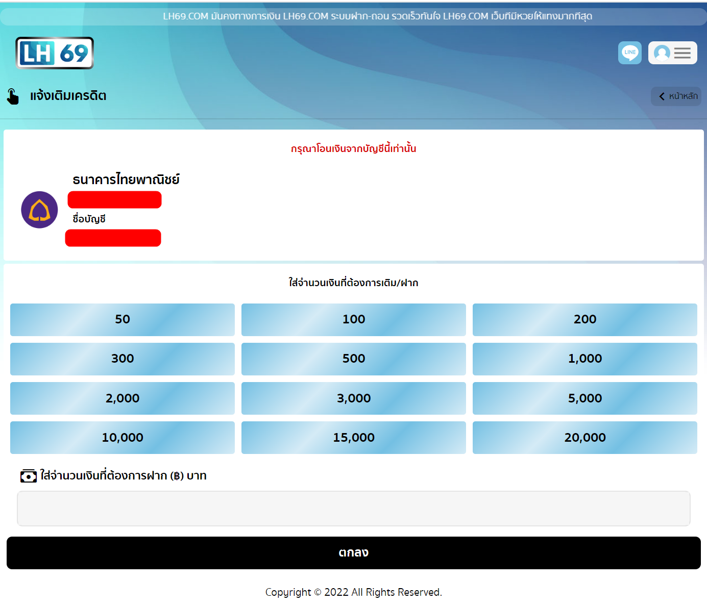 ระบบจะแจ้งว่าให้โอนเงินมาจากบัญชีของคุณที่ได้ลงทะเบียนเอาไว้เท่านั้น จะเลือกจำนวนที่ต้องการฝาก หรือ พิมพ์ตัวเลขเองก็ได้ แล้วกดปุ่ม “ตกลง”