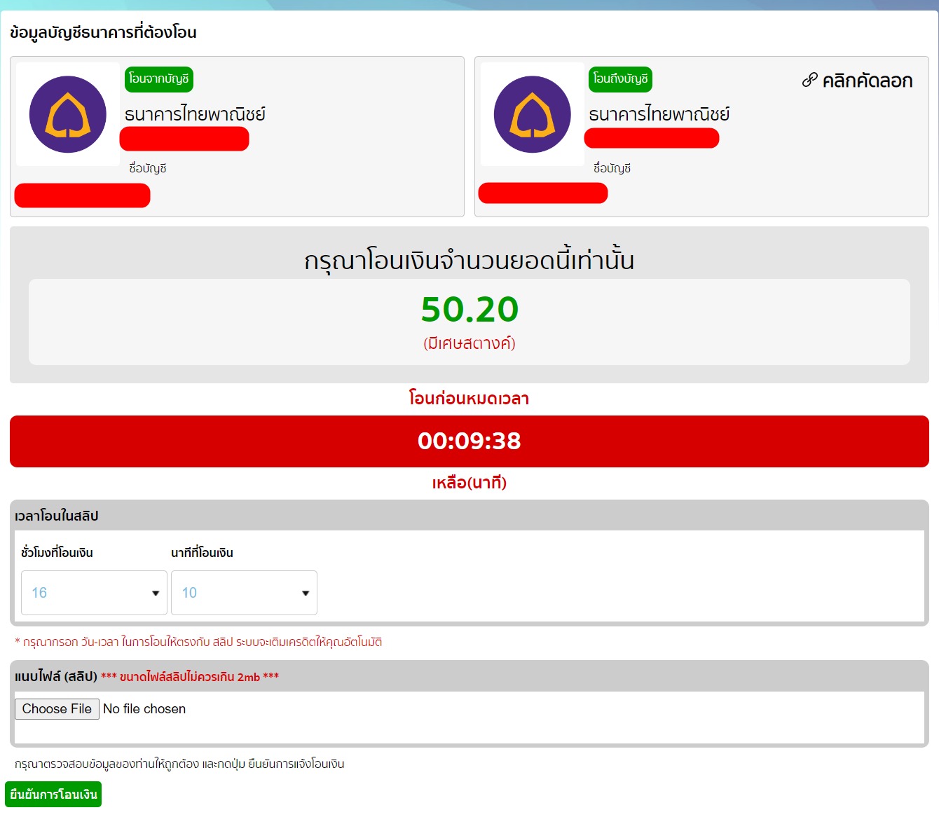 ระบบจะแจ้งให้เราไปโอนเงินจากบัญชีของเรา ไปยังบัญชีของระบบ เช่น ต้องการเติม 50 บาท ระบบจะแจ้งให้เราโอนเงิน 50.20 บาท ภายใน 10 นาที เมื่อโอนเสร็จให้มาแจ้ง เวลา และแนบสลิป แล้ว กด “ยืนยันการโอนเงิน”
